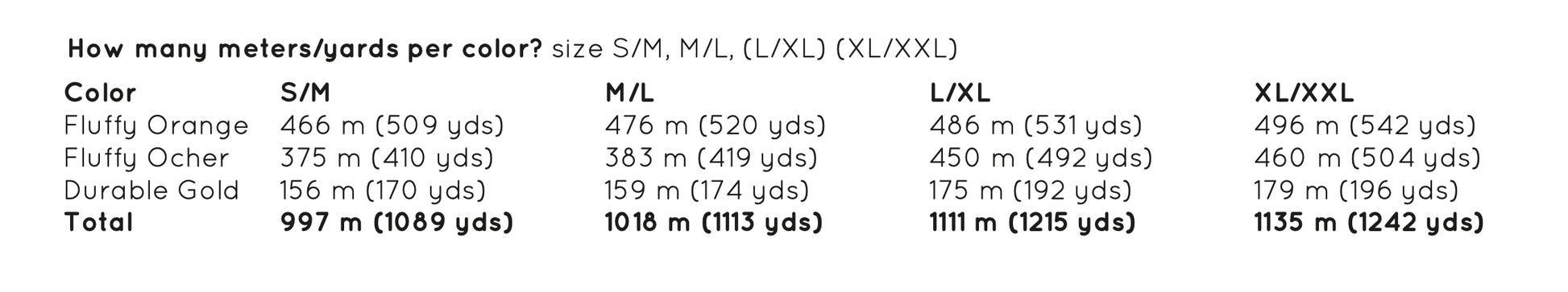 Hoeveel garen heb je nodig? (gebaseerd op de kleuren in de foto maat S/M, M/L, (L/XL & XL/XXL):